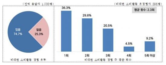 ºñ´ë¸é ¼ÒºñȰµ¿ °æÇèÀÌ ÀÖ´Ù°í ÀÀ´äÇÑ ºñÀ²Àº 74.7%À̸ç, À¯°æÇèÀÚ´Â ÁÖ Æò±Õ 2.3ȸ ºñ´ë¸é ¼ÒºñȰµ¿À» ÇÏ´Â °ÍÀ¸·Î Á¶»çµÇ¾ú´Ù.