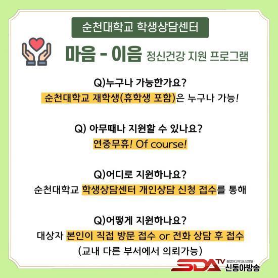 ¼øÃµ´ë Çлý»ó´ã¼¾ÅÍ´Â °¨¿°º´ °øÆ÷, ÀÏ»ó»ýȰ°ú ¿©°¡»ýȰ Á¦ÇÑ, Ãë¾÷ ¹× Àå·¡¿¡ ´ëÇÑ ¾Ð¹Ú ¹× ºÒ¾È°¨ µî¿¡ ³ëÃâµÇ±â ½¬¿î »óȲ¿¡¼ ÀçÇлýµéÀÌ ¸¶À½ °Ç°À» Áöų ¼ö ÀÖµµ·Ï ½ÇÁ¦ÀûÀÎ Áö¿ø¿¡ ³ª¼±â À§ÇØ À̹ø Áö¿ø ÇÁ·Î±×·¥À» ±âȹÇß´Ù.