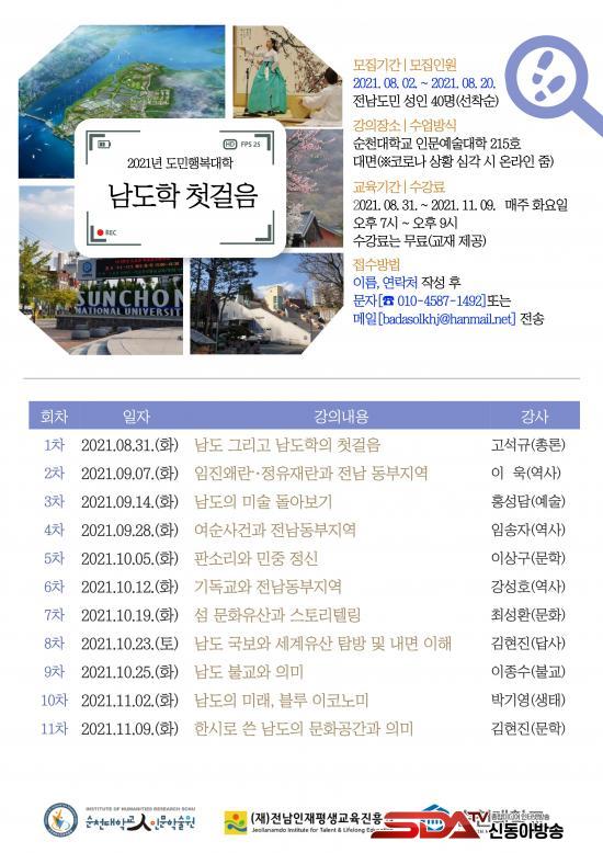 [½Åµ¿¾Æ¹æ¼Û=±è±â³² ±âÀÚ] ¼øÃµ´ëÇб³(ÃÑÀå °í¿µÁø) Àι®Çмú¿øÀÌ µµ¹ÎÀ» À§ÇÑ ³²µµ Àι®ÇÐ Æò»ý±³À° Ȱ¼ºÈ­¸¦ À§ÇØ¡®2021³â ³²µµÇРù°ÉÀ½¡¯ °­ÀǸ¦ °³¼³ÇÑ´Ù°í ¹àÇû´Ù.