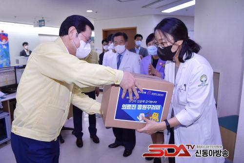 ¸ÕÀú À̿뼷 ½ÃÀå°ú ½Ã °£ºÎµéÀº 18ÀÏ ¿ÀÈÄ °¨¿°º´ Àü´ãº´¿øÀÎ º¸Èƺ´¿ø°ú ÀÏ°î ¼±º°Áø·á¼Ò µî 10°³ ±â°üÀ» Â÷·Ê·Î ¹æ¹®ÇØ 600¸í(ÀÇ»ç 117, °£È£»ç 228, ¹æ¿ªÁ¾»çÀÚ 255¸í)ÀÇ ¹æ¿ª Á¾»çÀÚ¿¡°Ô ½Ã¹ÎµéÀÇ ÀÀ¿øÇÏ´Â ¸¶À½À» ´ãÀº °¨»çÀåÀ» Àü´ÞÇß´Ù. ¶Ç ±¤ÁÖÀºÇà¿¡¼­ ÈÄ¿øÇÑ °Ý·Á ²Ù·¯¹Ìµµ Á¦°øµÆ´Ù.