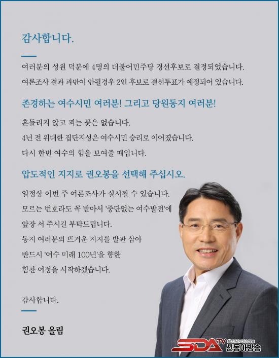 ÇÑÆí ±Ç¿ÀºÀ ¿©¼ö½ÃÀåÀº À̳¯ ´ë½Ã¹Î ÀÔÀå¹®À» ÅëÇØ ¡°°æ¼±¹æ½ÄÀÇ ¾Æ½¬¿òÀÌ ³²Áö¸¸ °ø°üÀ§ °áÁ¤À» Á¸ÁßÇÑ´Ù¡±¸ç ¡°4³âÀü À§´ëÇÑ Áý´ÜÁö¼ºÀ¸·Î ¿©¼ö½Ã¹ÎÀÇ ½Â¸®¸¦ À̲ö ¿©¼öÀÇ ÈûÀ» ´Ù½Ã º¸¿©ÁÙ ¶§´Ù. °á¼±±îÁö ¾ÐµµÀûÀÎ ÁöÁö·Î ±Ç¿ÀºÀÀ» ¼±ÅÃÇÒ °ÍÀ¸·Î ¹Ï´Â´Ù¡±°í ¹àÈ÷¸ç 4Àΰ漱°ú °á¼±ÅõÇ¥±îÁö Àڽۨ ÀÖ´Â ¸ð½ÀÀ» º¸¿´´Ù.