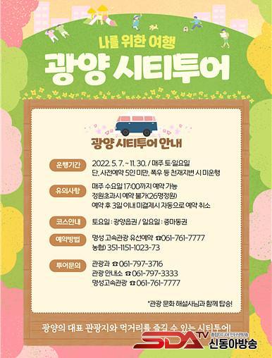 ±¤¾ç½ÃƼÅõ¾î¿¡ Âü¿©ÇÏ·Á¸é ¸ÅÁÖ ¼ö¿äÀÏ ¿ÀÈÄ 5½Ã±îÁö À¯¼±(¢Ï061-761-7777)À¸·Î ¿¹¾àÇØ¾ß Çϸç, 5¸í ÀÌ»ó ¿¹¾à ½Ã¿¡¸¸ ¿îÇàÇÑ´Ù.
