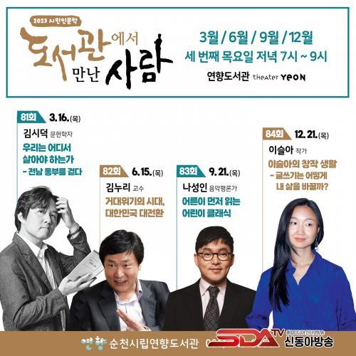 ¼øÃµ½Ã °ü°èÀÚ´Â ¡°½Ã¹ÎÀι®ÇÐ ¡®µµ¼°ü¿¡¼ ¸¸³ »ç¶÷¡¯Àº ¹®ÇÐ, ¿ª»ç, öÇÐ, ¿¹¼ú µî ´Ù¾çÇÑ ºÐ¾ßÀÇ Àú¸íÀλ縦 ÃÊûÇÏ¿© 2014³âºÎÅÍ ¸Å³â °³ÃÖÇϰí ÀÖÀ¸¸ç ¼øÃµ½Ã¸³¿¬Çâµµ¼°üÀ» ´ëÇ¥ÇÏ´Â ´ëÁß °¿¬À¸·Î ÀÚ¸®¸Å±èÇϰí ÀÖ´Ù. ¿ÃÇØ´Â 3¿ù ±è½Ã´ö ¹®ÇåÇÐÀÚ¸¦ ½ÃÀÛÀ¸·Î 6¿ù ±è´©¸® ±³¼ö, 9¿ù ³ª¼ºÀÎ À½¾ÇÆò·Ð°¡, 12¿ù À̽½¾Æ ÀÛ°¡ÀÇ °¿¬ÀÌ °¢±â ´Ù¸¥ ÁÖÁ¦·Î ÁøÇàµÇ´Ï ½Ã¹ÎºÐµéÀÇ ¸¹Àº Âü¿©¸¦ ºÎʵ台´Ù¡±¶ó°í ¸»Çß´Ù.