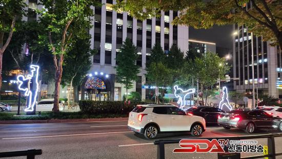 2.9m~4.2m ³ôÀÌÀÇ 11°³ÀÇ Á¶Çü¹°Àº ¿ªµ¿ÀûÀΠűǵµ ǰ»õ¸¦ Çü»óÈÇß´Ù. ±¹±â¿ø »ç°Å¸®¸¦ Áß½ÉÀ¸·Î ¿ª»ï¿ª ¹æÇâ¿¡ ¼³Ä¡µÈ 5°³ÀÇ Á¶Çü¹°Àº űǵµ ±â¼ú ¡®µ¹°³Â÷±â¡¯ÀÇ ¿¬¼Ó µ¿ÀÛÀÌ´Ù. ±¹±â¿ø »ç°Å¸®¿Í °³²¿ª ¹æÇâÀ¸·Î °¢ 3°³¾¿ ¼³Ä¡µÈ ÃÑ 6°³ Á¶Çü¹°Àº űǵµ ´ÜÀÏ µ¿ÀÛÀÎ ¡®¹ßÂ÷±â¡¯¿Í ¡®¸·±â¡¯ ÀÚ¼¼¸¦ º»¶¹´Ù. ¾ß°£¿¡ Á¶Çü¹°Àº ³»ºÎ LED Á¶¸íÀ¸·Î ºû³´Ù. ¼±¸íÇÏ°Ô ºû³ª´Â Á¶Çü¹°Àº ¿ªµ¿Àû ÀÚ¼¼¸¦ ºÎ°¢½ÃŰ¸é¼ Å×Çì¶õ·Î ¹ã°Å¸®¿¡ Ȱ·ÂÀ» ºÒ¾î³ÖÀ» °ÍÀ¸·Î ±â´ëµÈ´Ù.