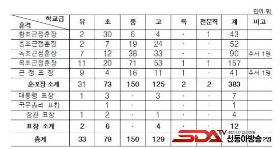 ¡à À̹ø Á¤ºÎÆ÷»ó ´ë»óÀÚ´Â À¯¡¤ÃÊ¡¤Áßµî ±³¿ø 395¸íÀ¸·Î, ȲÁ¶±ÙÁ¤ÈÆÀå 43¸í, È«Á¶±ÙÁ¤ÈÆÀå 52¸í, ³ìÁ¶±ÙÁ¤ÈÆÀå 90¸í, ¿ÁÁ¶±ÙÁ¤ÈÆÀå 157¸í, ±ÙÁ¤Æ÷Àå 41¸í, ´ëÅë·Éǥâ 7¸í, ±¹¹«ÃѸ®Ç¥Ã¢ 1¸í, Àå°üǥâ 4¸íÀÌ´Ù.