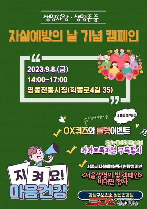 ±¸´Â 8ÀÏ ¿ÀÈÄ 2½ÃºÎÅÍ 5½Ã±îÁö ¿µµ¿ÀüÅë½ÃÀå(Çе¿·Î4±æ 35)¿¡¼ Àڻ쿹¹æ Ä·ÆäÀÎÀ» ½Ç½ÃÇÑ´Ù. Àڻ쿹¹æ Áֹΰøµ¿Ã¼ ¡®¸¶À½°Ç°Áֹα³À°´Ü¡¯ 13¸í°ú ÇÔ²² ·ê·¿À» Ȱ¿ëÇØ ³ª¿Í ŸÀο¡°Ô À§·Î¿Í Èñ¸ÁÀÇ ¸¶À½ Ç¥ÇöÇϱâ, Àڻ쿡 ¿Ã¹Ù¸¥ Á¤º¸¸¦ Á¦°øÇÏ´Â OX ÄûÁî, °³²±¸Á¤½Å°Ç°º¹Áö¼¾ÅÍ Ä«Ä«¿ÀÅåä³Î ±¸µ¶ À̺¥Æ®, ¼¿ï½Ã Àڻ쿹¹æ¼¾ÅÍ ¿¬ÇÕÄ·ÆäÀÎ ¡®¼¿ï»ý¸íÀÇ ºû Ä·ÆäÀΡ¯ ¿Â¶óÀÎ Âü¿© È«º¸ µîÀ¸·Î ÀÌ·ïÁø´Ù. Ä·ÆäÀο¡ Âü¿©ÇÑ ±¸¹Î°ú »óÀε鿡°Ô Áö¼ÓÀûÀÎ ¸¶À½ °Ç°°ü¸®¸¦ À§ÇÑ µµ¿ò±â°ü Á¤º¸ ¾È³» ¹× È«º¸¹°À» Á¦°øÇÑ´Ù.