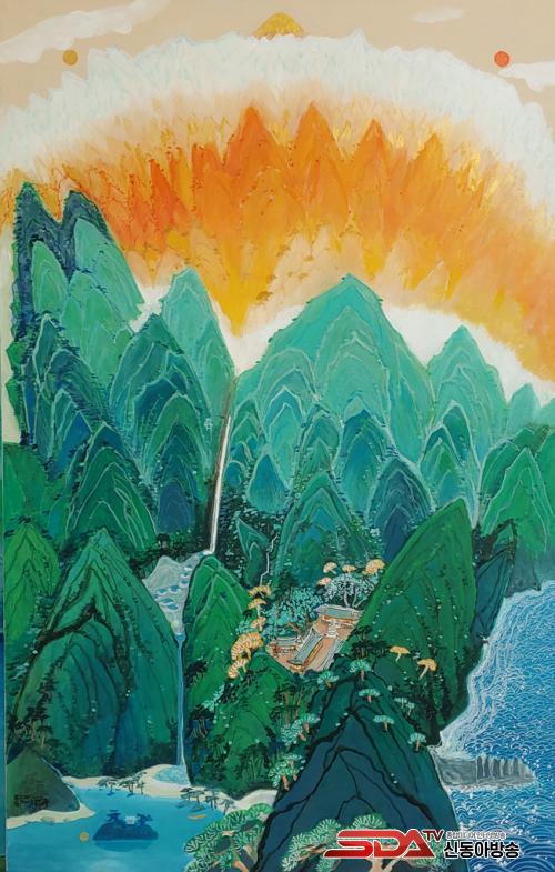 ±×¸² ¼Ó¿¡´Â ¿À¹æ»ö°ú ´ÜûÀÇ Ã»·Ï»ê¼ö ¸Ô°ú ¾ÆÅ©¸±È¥ÇÕ Àç·á·Î ÇÑÁö¿Í ĵ¹ö½º¿¡ °³±Ý°ú ÈëÀ» ÀÔÈ÷°í ÇØ¿Í ´Þ ¹°¼Ò¸®, ¹Ù¶÷¼Ò¸®, ¼Ö¹Ù¶÷ ¼Ò¸®, ¾ÆÄ§ÀÇ »õ¼Ò¸®¸¦ ´ã¾Ò´Ù. ±Ý°­»ê, ´Ü¾çÆÈ°æ, Á¦ÁÖµµ µîÀÇ ½ÇÁ¦ dz°æÀº »ó»ó¼ÓÀÇ ´ëÀÚ¿¬À» ¹Ù¶óº¸µí ¸ùȯÀûÀ̰í ȯ»óÀûÀÌ´Ù. ÀüüÀûÀÎ »ê¼¼ÀÇ Çü»óÀ» ÁüÀÛÇÏ°Ô ÇÏ´Â ´É¼±À̳ª ³ª¹«, ÆøÆ÷, ¹ÙÀ§, Áý µîÀÇ ¹¦»ç´Â Çѱ¹È­¿¡¼­ º¼ ¼ö ÀÖ´Â ±â¹ýÀ¸·Î ÀÌÇØ·ÂÀ» ³ô¿´´Ù.