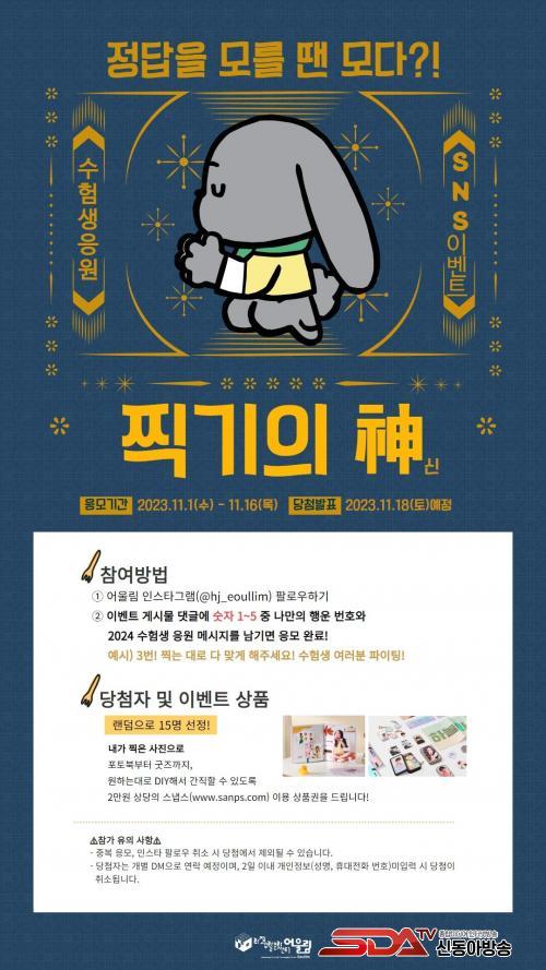 À̹ø À̺¥Æ®´Â °¡Á·°ú Ä£±¸, ÀÌ¿ôµéÀÌ ÇÔ²² ¼ö´ÉÀ» ¾ÕµÐ ¼öÇè»ýµé¿¡°Ô ÀÀ¿øÀÇ ¸Þ½ÃÁö¸¦ Àü´ÞÇϱâ À§ÇØ ±âȹµÈ °ÍÀ¸·Î À̺¥Æ® ÁÖÁ¦ÀÎ ¡®Âï±âÀÇ ½Å¡¯Àº °ü¿ëÀû Ç¥ÇöÀ¸·Î Á¤´äÀ» Àß °í¸£±â¸¦ ±â¿øÇÏ´Â ¸Þ½ÃÁö´Ù.