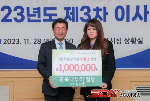 À̳¯ ÀÌ»çȸ¸¦ ¸¶Ä£ ÈÄ, ±³À°³ª´©¸®(½ÉÁÖ¶õ ȸÀå)¿¡¼ ¡®¸ðµÎ¿¡°Ô ÆòµîÇÑ ±³À°±âȸ Á¦°øÀ» À§ÇÑ ÀåÇÐÀÚ±ÝÀ¸·Î ½á´Þ¶ó¡¯¸ç ÀϹ鸸 ¿øÀ» ÀåÇбÝÀ¸·Î ±âŹÇß´Ù.