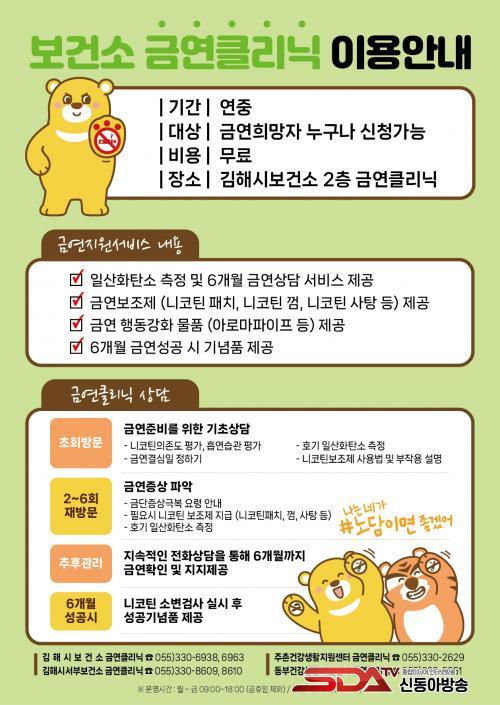 ±èÇØ½Ãº¸°Ç¼Ò 2Ãþ¿¡ À§Ä¡ÇÑ ±Ý¿¬Å¬¸®´ÐÀº ÆòÀÏ ¿ÀÀü9½ÃºÎÅÍ ¿ÀÈÄ6½Ã±îÁö ¿î¿µÇÏ¸ç ±Ý¿¬À» Èñ¸ÁÇÏ´Â ½Ã¹Î ´©±¸³ª ÀÌ¿ë °¡´ÉÇÏ¸ç ±èÇØ½Ãº¸°Ç¼Ò ³»¼Ò°¡ ¾î·Á¿î ½Ã¹ÎµéÀº ±èÇØ½Ã¼ºÎº¸°Ç¼Ò, µ¿ºÎ°Ç°»ýȰÁö¿ø¼¾ÅÍ, ÁÖÃ̰ǰ»ýȰÁö¿ø¼¾Å͵µ ³»¼ÒÇÏ¿© »ó´ãÀÌ °¡´ÉÇÏ´Ù.