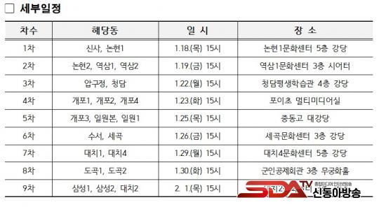 º¸°íȸ´Â °³²±¸ 22°³ µ¿À» 2~3°³¾¿ ¹¾î ÃÑ 9ȸ¿¡ °ÉÃÄ ÁøÇàÇÑ´Ù. ¼¼ºÎ ÀÏÁ¤À» º¸¸é. 1Â÷´Â ½Å»ç¡¤³íÇö1µ¿À¸·Î 1¿ù 18ÀÏ ³íÇö1¹®È¼¾ÅÍ 5Ãþ °´ç. 2Â÷ ³íÇö2¡¤¿ª»ï1¡¤¿ª»ï2µ¿ 1¿ù 19ÀÏ ¿ª»ï1¹®È¼¾ÅÍ 3Ãþ ½Ã¾îÅÍ. 3Â÷ ¾Ð±¸Á¤¡¤Ã»´ãµ¿ 1¿ù 22ÀÏ Ã»´ãÆò»ýÇнÀ°ü 4Ãþ °´ç. 4Â÷ °³Æ÷1¡¤°³Æ÷2¡¤°³Æ÷4µ¿ 1¿ù 23ÀÏ Æ÷ÀÌÃÊ ¸ÖƼ¹Ìµð¾î½Ç. 5Â÷ °³Æ÷3¡¤ÀÏ¿øº»¡¤ÀÏ¿ø1µ¿ 1¿ù 25ÀÏ Áßµ¿°í ´ë°´ç. 6Â÷ ¼ö¼¡¤¼¼°îµ¿ 1¿ù 26ÀÏ ¼¼°î¹®È¼¾ÅÍ 3Ãþ °´ç. 7Â÷ ´ëÄ¡1¡¤´ëÄ¡4µ¿ 1¿ù 29ÀÏ ´ëÄ¡4¹®È¼¾ÅÍ 5Ãþ °´ç. 8Â÷ µµ°î1¡¤µµ°î2µ¿ 1¿ù 30ÀÏ ±ºÀΰøÁ¦È¸°ü 3Ãþ ¹«±ÃÈȦ. 9Â÷ »ï¼º1¡¤»ï¼º2¡¤´ëÄ¡2µ¿ 2¿ù 1ÀÏ ´ëÄ¡2¹®È¼¾ÅÍ 3Ãþ °´ç¿¡¼ ¿¸°´Ù. ¸ðµÎ ¿ÀÈÄ 3½Ã¿¡ °³ÃÖÇϸç, ±¸Á¤¿¡ °ü½É ÀÖ´Â ÁÖ¹ÎÀÌ¸é ´©±¸³ª Âü¿©ÇÒ ¼ö ÀÖ´Ù.