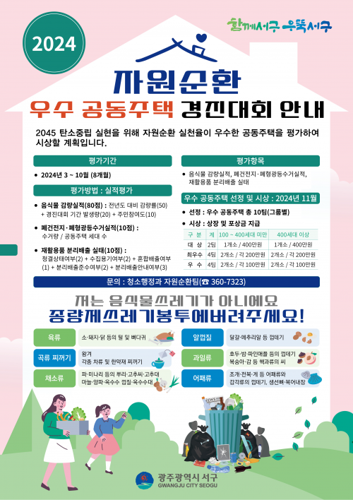 ¼±¸´Â ¿ÃÇØ 3¿ùºÎÅÍ 10¿ù±îÁö ¡ãÀ½½Ä¹° °¨·®½ÇÀû(80Á¡) ¡ãÆóÇü±¤µî ¡¤ Æó°ÇÀüÁö ¼ö°Å½ÇÀû(10Á¡) ¡ãÀçȰ¿ëǰ ºÐ¸®¹èÃâ ½ÇÅÂ(10Á¡) ÃÑ 3°³ ºÐ¾ßÀÇ ÀÚ¿ø¼øÈ¯ ½ÇõÀ²À» Æò°¡ÇØ, ¿À´Â 11¿ù ¿ì¼ö °øµ¿ÁÖÅà ÃÑ 10ÆÀ(´ë»ó 2, ÃÖ¿ì¼ö 4, ¿ì¼ö 4)¿¡°Ô »óÀå ¹× 2000¸¸¿øÀÇ Æ÷»ó±ÝÀ» Â÷µî Áö±ÞÇÒ °èȹÀÌ´Ù.