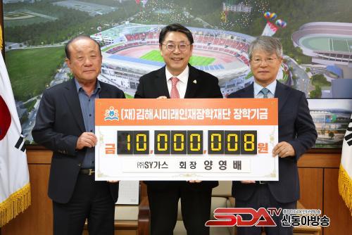 [½Åµ¿¾Æ¹æ¼Û´º½º=ÃÖ¼ÛÈ­±âÀÚ] ±èÇØ½Ã¹Ì·¡ÀÎÀçÀåÇÐÀç´Ü(ÀÌ»çÀå ÇöÁ¾¿ø)Àº 19ÀÏ SY°¡½º(ȸÀå ¾ç¿µ¹è)¿¡¼­ ÀåÇбâ±Ý 1,000¸¸¿øÀ» ±âŹÇß´Ù°í ¹àÇû´Ù.
