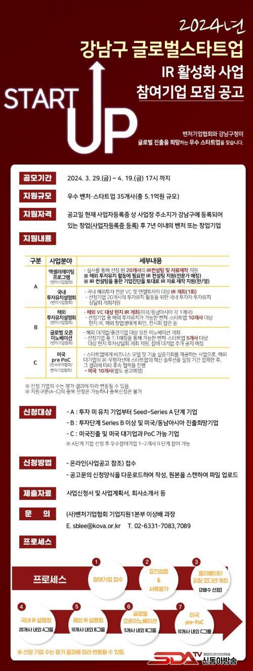 [½Åµ¿¾Æ¹æ¼Û °­³²±¸=À̽ŵ¿±âÀÚ]°­³²±¸°¡ °ü³» ¿ì¼ö ½ºÅ¸Æ®¾÷À» ¹ß±¼Çϰí ÇØ¿Ü ÁøÃâÀ» µ½±â À§ÇØ ¡®2024 °­³²±¸ ±Û·Î¹ú ½ºÅ¸Æ®¾÷ IR IR(investor relations): ÅõÀÚÀÚµéÀ» ´ë»óÀ¸·Î ±â¾÷ ¼³¸í ¹× È«º¸ Ȱµ¿À» ÇÏ¿© ÅõÀÚ À¯Ä¡¸¦ ¿øÈ°ÇÏ°Ô Çϴ Ȱµ¿ Ȱ¼ºÈ­ Áö¿ø»ç¾÷(ÀÌÇÏ IR Áö¿ø»ç¾÷)¡¯°ú ¡®½ºÅ¸Æ®¾÷ ÇØ¿Ü Å×½ºÆ®º£µå 縰Áö in USA 4±â(Å×½ºÆ®º£µå Áö¿ø»ç¾÷)¡¯¿¡ Âü¿©ÇÒ ±â¾÷À» ¿À´Â 19ÀϱîÁö ¸ðÁýÇÑ´Ù.
