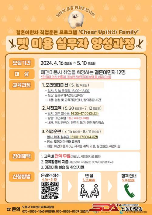 µµºÀ±¸°¡Á·¼¾ÅÍ(¼¾ÅÍÀå °Áø¾Æ)¿Í µµºÀ¿©¼º¼¾ÅÍ(°üÀå ¹ÚÂù¾Ö)°¡ ÇÔ²² ¸¶·ÃÇÑ À̹ø °úÁ¤Àº »çÀü±³À°, Á÷¾÷ÈÆ·Ã, »çÈİü¸®·Î ±¸¼ºµÈ´Ù. Àü °úÁ¤Àº µµºÀ±¸°¡Á·¼¾ÅͰ¡ ¿î¿µ‧°ü¸®Çϸç, µµºÀ¿©¼º¼¾ÅÍ´Â Á÷¾÷ÈÆ·Ã°ú »çÈİü¸®¸¦ ´ã´çÇÑ´Ù.