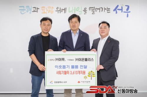 [½Åµ¿¾Æ¹æ¼Û ÀÎõ= À±¹Î½Ä±âÀÚ] ÀÎõ ¼­±¸(±¸Ã»Àå °­¹ü¼®)´Â 8¿ù 13ÀÏ ¢ßÀÌǪ(´ëÇ¥ÀÌ»ç ±èÀçÁØ), ¢ßÀÌ¿ÂÆú¸®½º(´ëÇ¥ÀÌ»ç Ȳ±ÔÁø)·ÎºÎÅÍ ÀÌ¿ô»ç¶û ¹°Ç°(»þ¿ö±âÇÊÅÍ) 3,610°³¸¦ ±âŹ¹Þ¾Ò´Ù. À̳¯ Àü´Þ¹ÞÀº »þ¿ö±âÇÊÅÍ´Â ¼­±¸ ³» ³ëÀκ¹Áö°ü ¹× Àú¼ÒµæÁֹο¡°Ô Áö¿øµÉ ¿¹Á¤ÀÌ´Ù.