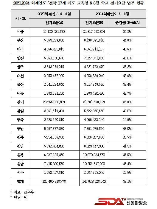 ½Ãµµ ±³À°Ã»º° Àü±â¿ä±Ý Áõ°¡À²Àº °æºÏ(47.5%)ÀÌ °¡Àå ³ô°í ´ÙÀ½Àº °æ³²(46.4%), ÀÎõ(46.0%), ºÎ»ê(44.8%), ¼¼Á¾(43.7%), Ãæ³²¡¤°¿ø(43.0%) ¼øÀ¸·Î ³ªÅ¸³µ´Ù.