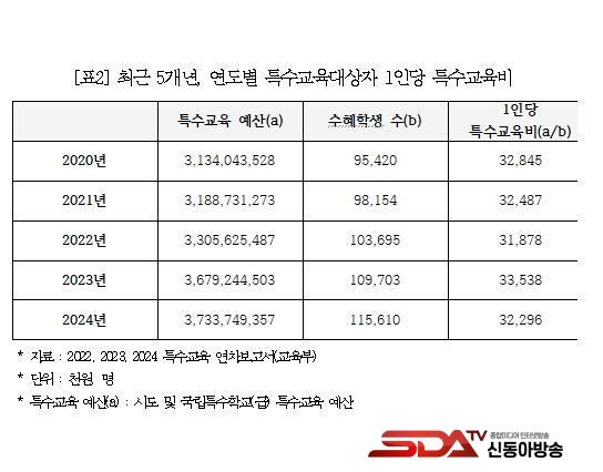 ÀÌó·³ Ư¼ö±³À° ´ë»óÀÚ´Â °¥¼ö·Ï Áõ°¡Çϰí ÀÖÁö¸¸, ±³À°¿©°ÇÀº Á¤ºÎ¿Í ±³À°´ç±¹ÀÇ °ü½É°ú Áö¿ø ºÎÁ·À¸·Î ¾ÆÁ÷ ¿ä¿øÇÑ °ÍÀ¸·Î µå·¯³µ´Ù. Ư¼ö±³À°´ë»óÀÚ 1ÀÎ´ç ±³À°ºñ´Â 2020³â 3,284¸¸¿ø ´ëºñ 2024³â 3,229¸¸¿øÀ¸·Î 1.67% °¨¼ÒÇÏ¿´°í, Àüü ±³À°¿¹»ê Áß Æ¯¼ö±³À°¿¹»ê ºñÁßÀº 2023³â 4.05%¿¡¼ 2024³â 4.37%·Î ¼ÒÆø Áõ°¡Çß´Ù. 2020³â 4.40%¿´´ø °ÍÀ» °¨¾ÈÇÏ¸é Æ¯¼ö±³À° ¼ö¿ä¿¡ ºñÇØ ÅξøÀÌ ºÎÁ·ÇÏ´Ù´Â ÁöÀûÀÌ´Ù.