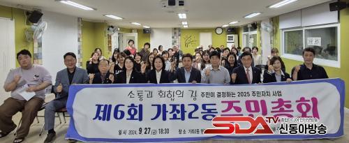 °¡ÁÂ2µ¿ ÁÖ¹ÎÀÚġȸ´Â 2019³â ¼±¸ ÃÖÃÊ·Î ÁÖ¹ÎÀÚġȸ ½Ã¹üµ¿À¸·Î ¼±Á¤µÇ¾î ¿ÃÇØ·Î ¿©¼¸ ¹øÂ° ÁÖ¹ÎÃÑȸ¸¦ °³ÃÖÇÏ¿´´Ù. À̺ÎÁ¾ ȸÀåÀÇ °³È¸¼±¾ðÀ» ½ÃÀÛÀ¸·Î ³»ºó Ãà»ç¿Í 2024³â ½ÇÇà»ç¾÷ ¹× 25³â ÀÚÄ¡°èȹ º¸°í, ³»³âµµ ÁÖ¹ÎÀÚÄ¡ ½Ã¹ü»ç¾÷ 6°³ ÀÇÁ¦ ¼³¸í ¹× ÅõÇ¥°á°ú ¹ßÇ¥ ¼øÀ¸·Î ÁøÇàµÆ´Ù. ÁÖ¹ÎÃÑȸ¸¦ À§ÇØ ±è±³Èï ±¹È¸ÀÇ¿ø. ½Ã¡¤±¸ÀÇ¿ø, Áö¿ª´ÜüÀå µîÀÌ Âü¼®ÇÏ¿´À¸¸ç, °¹ü¼® ¼±¸Ã»ÀåÀº ¿µ»ó Àλ縻À» ÅëÇØ À̳¯ Çà»ç¸¦ ÃàÇÏÇÏ¿´´Ù.