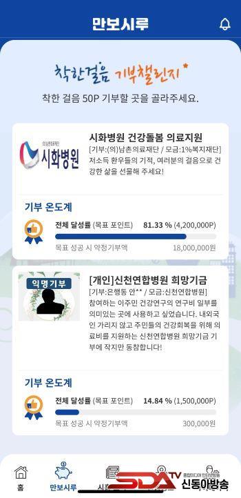 ¸¸º¸½Ã·ç ±âºÎ縰Áö´Â 1¸¸ °ÉÀ½ ÀÌ»óÀ» °ÉÀ¸¸é ½ÃÈï½Ã Áö¿ªÈÆóÀÎ ¸ð¹ÙÀÏ ½Ã·ç 100¿øÀÌ Àû¸³µÇ´Â ¡®¸¸º¸½Ã·ç¡¯ ¾Û(App)À» ÅëÇØ °ÉÀ½ ¼ö Æ÷ÀÎÆ®¸¦ ±âºÎÇÒ ¼ö ÀÖ´Â ±â´ÉÀÌ´Ù. ±âºÎ Âü¿©ÀÚÀÇ ¸ñÇ¥ °ÉÀ½ ¼ö°¡ ´Þ¼ºµÇ¸é ±â¾÷ µîÀÌ ¾àÁ¤ÇÑ ±Ý¾×À» ±âºÎ ¸ðÁý±â°ü(½ÃÈï½Ã1%º¹ÁöÀç´Ü, ½Åõ¿¬ÇÕº´¿ø)¿¡ Àü´ÞÇÏ°Ô µÈ´Ù.
