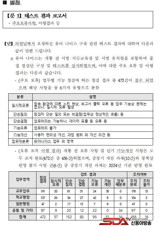 ¡à Çѱ¹±³À°ÇмúÁ¤º¸¿ø <°³Åë Àü Å×½ºÆ® ½Ç½Ã ¹× Á¶Ä¡ °á°ú>¿¡ µû¸£¸é ¿À·ù »çÇ× ¹× ´Ü±â ±â´É°³¼± »çÇ×Àº ±³¹«¾÷¹« 191°Ç, Çб³ÇàÁ¤ 137°Ç, ÀϹÝÇàÁ¤ 47°Ç, ±âŸ 97°Ç µî ¸ðµÎ 472°ÇÀ̸ç ÀÌ Áß 456°ÇÀº Á¶Ä¡¸¦ ¿Ï·áÇß°í ÁßÀå±â °³¼±°úÁ¦ 10°Çµµ ¿ÃÇØ ¹Ý¿µÇß´Ù. ³ª¸ÓÁö 6°ÇÀº Á¤Ã¥»ó ¹Ý¿µÀÌ ºÒ°¡ÇÑ °ÍÀ¸·Î 󸮵ƴÙ.