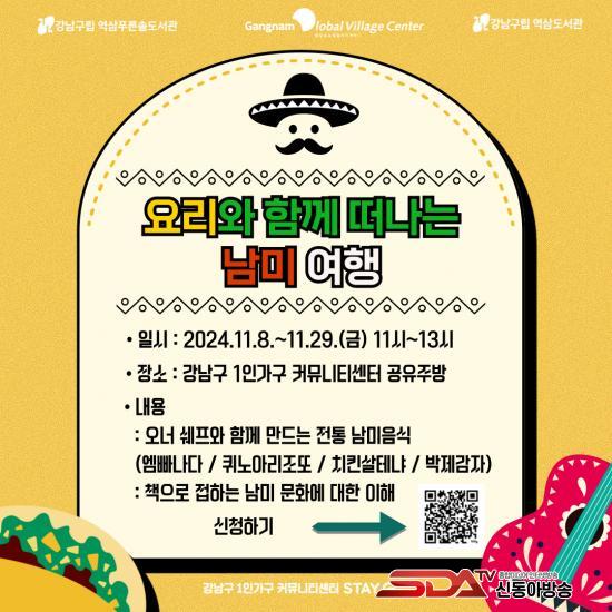 11¿ù 8ÀϺÎÅÍ 29ÀϱîÁö ¸ÅÁÖ ±Ý¿äÀÏ 11½ÃºÎÅÍ 13½Ã±îÁö ¡®¿ä¸®·Î ¶°³ª´Â ³²¹Ì ¿©Ç࡯À» ÁøÇàÇÑ´Ù. °³²±Û·Î¹úºô¸®Áö¼¾ÅÍ¿Í ¿¬°èÇØ ³²¹Ì Ãâ½Å ¿À³Ê½¦ÇÁÀÎ ±è³ª¿µ ¾¾°¡ °»ç·Î Âü¿©ÇØ, ³²¹ÌÀÇ ´ëÇ¥ ¿ä¸®ÀÎ ¿¥ÆÄ³ª´Ù, Äû³ë¾Æ ¸®¼ÒÅä, ġŲ »ìÅ׳Ä, ¹ÚÁ¦°¨ÀÚ µî ´Ù¾çÇÑ ¿ä¸®¸¦ ¼±º¸ÀδÙ. ÀÌ ±â°£ ¿ª»ïµµ¼°ü, ¿ª»ïǪ¸¥¼Öµµ¼°ü°ú Çù·ÂÇØ ³²¹Ì ¿ä¸®¿Í ¹®È¸¦ ¼Ò°³Çϴ å 100±ÇÀ» ¼±Á¤ÇØ ¼¾ÅÍ ³» ·Îºñ¿¡ Àü½ÃÇÒ °èȹÀÌ´Ù.