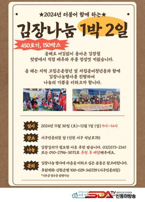 ¡¸´õºÒ¾î ÇÔ²² ÇÏ´Â ±èÀ峪´® 1¹Ú 2ÀÏ¡¹Çà»ç´Â ¡®¼±¸¹ÎÁßÀÇÁý¡¯°ú ¡®ÀÎõ¼±¸Áö¿ªÀÚȰ¼¾ÅÍ¡¯°¡ °øµ¿À¸·Î 13ȸ° ÃßÁøÇÏ´Â Çà»çÀÌ´Ù. ¿ÃÇØ´Â û³â¼ºÀåÇÁ·ÎÁ§Æ® û³âµé°ú ÇÔ²² ÀÚ¸³Áغñû³â ¹× µµ¿òÀÌ ÇÊ¿äÇÑ Ã»¼Ò³âÀ» À§ÇØ 450Æ÷±â ±èÀåÀ» ÇÏ¿© ³ª´®À» ÇÒ ¿¹Á¤ÀÌ´Ù.