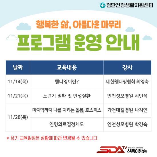 [½Åµ¿¾Æ¹æ¼Û ÀÎõ= À±¹Î½Ä±âÀÚ] ÀÎõ ¼­±¸(±¸Ã»Àå °­¹ü¼®) °Ë´Ü°Ç°­»ýȰÁö¿ø¼¾ÅÍ¿¡¼­´Â ÀλýÀÇ ¸¶Áö¸· ¼ø°£À» ¾Æ¸§´ä°Ô ¸¶¹«¸®Çϱâ À§ÇÑ Áغñ ÇÁ·Î±×·¥ÀÎ À£´ÙÀ×(Well- Dying) ±³À°À» ¿î¿µÇÒ ¿¹Á¤ÀÌ´Ù.