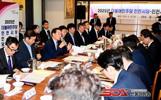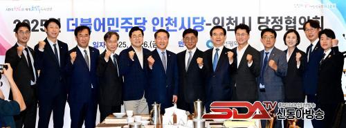 »çÁø=À¯Á¤º¹ ÀÎõ±¤¿ª½ÃÀåÀÌ 26ÀÏ ¼­¿ï ¿©Àǵµ¿¡¼­ ¿­¸° \'´õºÒ¾î¹ÎÁÖ´ç ÀÎõ½Ã´ç-ÀÎõ½Ã ´çÁ¤ÇùÀÇȸ\'¿¡¼­ °í³²¼® ½Ã´çÀ§¿øÀå ¹× Âü¼®ÀÚµé°ú ±â³äÃÔ¿µÀ» Çϰí ÀÖ´Ù.