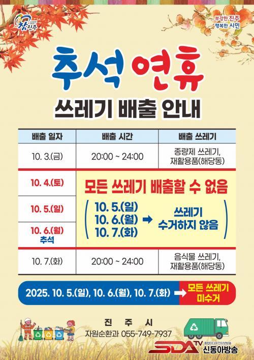 ÀÌ ¹Û¿¡µµ ¿¬ÈޱⰣ Áß 10¿ù 5, 6, 7ÀÏ 3Àϰ£Àº ¸ðµç ¾²·¹±â¸¦ ¼ö°ÅÇÏÁö ¾ÊÀ¸¹Ç·Î 4~6ÀÏÀº ¾²·¹±â¸¦ ¹èÃâÇÏÁö ¾Êµµ·Ï À¯ÀÇÇØ¾ß Çϸç, ÀÚ¼¼ÇÑ »çÇ×Àº ÁøÁֽà ´©¸®Áý(½ÃÁ¤¼Ò½Ä>¾Ë¸²Ã¢)¿¡¼ È®ÀÎ °¡´ÉÇÏ´Ù.