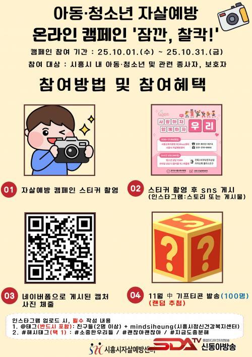 Ä·ÆäÀÎ Âü¿© ¹æ¹ýÀº ½ÃÈï½Ã °ü³» ±³À°±â°ü, ÇàÁ¤º¹Áö¼¾ÅÍ, ¾Æµ¿¤ýû¼Ò³â °ü·Ã ±â°ü µî¿¡ ºÎÂøµÈ ÀÚ»ì ¿¹¹æ È«º¸ ½ºÆ¼Ä¿¸¦ ÃÔ¿µÇÑ ÈÄ, °³ÀÎ ´©¸®¼ÒÅë¸Á(ÀνºÅ¸±×·¥)¿¡ ½ºÅ丮 ¶Ç´Â °Ô½Ã¹° ÇüÅ·Π¿Ã¸®¸é µÈ´Ù. ÀÌÈÄ ÇØ´ç °Ô½Ã¹°À» Ä¸Ã³ÇØ Á¤º¸¹«´Ì(Å¥¾ËÄÚµå)¸¦ ÅëÇØ ¿¬°áµÈ ³×À̹ö Æû¿¡ Á¦ÃâÇϸé Âü¿©°¡ ¿Ï·áµÈ´Ù.
