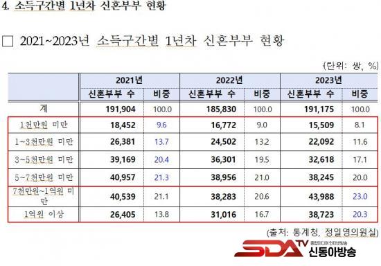 ÇÑÆí, ¿¬¼Òµæ 1¾ï ¿ø ÀÌ»ó ½ÅÈ¥ºÎºÎ ºñÁßÀº 2021³â 13.8% ¡æ 2023³â 20.3%·Î ±ÞÁõÇß´Ù. 5õ~7õ¸¸ ¿ø ¹Ì¸¸ ¼Òµæ ±¸°£ÀÇ ½ÅÈ¥ºÎºÎ ºñÁßÀº °°Àº ±â°£ 21.3%¿¡¼ 20.0%·Î °¨¼ÒÇØ, ½ÅÈ¥ºÎºÎ ³» ¼Òµæ ¾ç±ØÈ°¡ ½Éȵǰí ÀÖ´Ù.