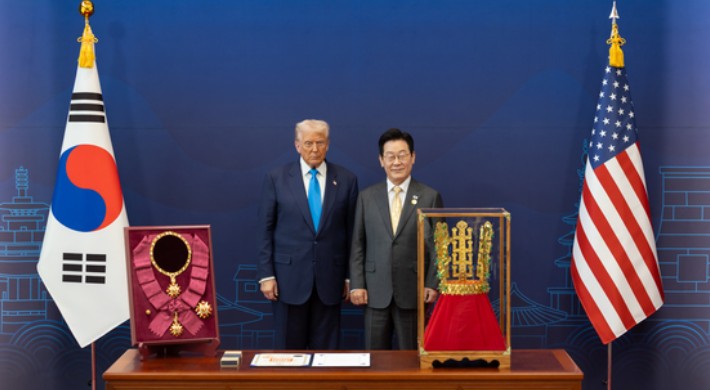 »çÁø=ÀÌÀç¸í ´ëÅë·ÉÀÌ Æ®·³ÇÁ ´ëÅë·É¿¡°Ô ¹«±ÃÈ­ ´ëÈÆÀå°ú ½Å¶ó½Ã´ë ¿Õ°ü ¸ðÇüÀ» ¼±¹°Çϰí ÀÖ´Ù. sns