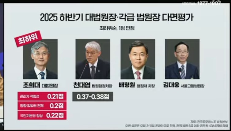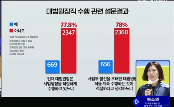 ¹ý¿øº»ºÎ´Â À̳¯, 11¿ù 3ÀϺÎÅÍ 11ÀϱîÁö Àü±¹ ¹ý¿øÀÇ 5±Þ ÀÌÇÏ ¹ý¿ø°ø¹«¿ø 4,364¸íÀÌ Âü¿©ÇÑ °¡¿îµ¥ ÁøÇàµÈ ´Ù¸éÆò°¡ ¼³¹®Á¶»ç °á°ú¸¦ °ø°³Çϸé¼, Á¶Èñ´ë ´ë¹ý¿øÀåÀÇ °ü¸®ÀڷμÀÇ ÀûÇÕ¼º, ÇàÁ¤¡¤ÀÔ¹ýºÎ °ßÁ¦ ¿ªÇÒ, ±¹¹Î±âº»±Ç º¸È£ µî ÇÙ½É Ç׸ñ ¸ðµÎ¿¡¼ ¡®ºÎÀûÇÕ¡¯ Æò°¡°¡ 79%¿¡ ´ÞÇßÀ¸¸ç, ƯÈ÷ Á¶Èñ´ëÀÇ °ÅÃ븦 ¹¯´Â ¹®Ç׿¡ ÀÀ´äÇÑ 3,016¸í Áß 78%°¡ »çÅð°¡ ÇÊ¿äÇÏ´Ù ´äÇß´Ù°í ¹àÇû´Ù.