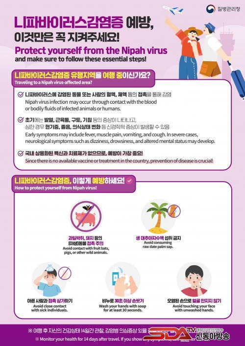 ´ÏÆÄ¹ÙÀÌ·¯½º °¨¿°ÁõÀº Ä¡¸í·üÀÌ 40~75%·Î ³ô°í ¹é½Å¤ýÄ¡·áÁ¦°¡ ¾ø´Â À§ÇèÇÑ Áúº´À¸·Î ¿¹¹æÀÌ ¹«¾ùº¸´Ù Áß¿äÇÏ´Ù. Àεµ¿Í ¹æ±Û¶óµ¥½Ã µî ´ÏÆÄ¹ÙÀÌ·¯½º °Ë¿ª°ü¸®Áö¿ªÀ» ¹æ¹®ÇÒ °æ¿ì °úÀϹÚÁ㳪 ¾ÆÇ µÅÁö µî ¾ß»ýµ¿¹°°úÀÇ Á¢ÃËÀ» ÇÇÇϰí, »ý ´ëÃß¾ßÀÚ ¼ö¾×À̳ª ¹Ù´Ú¿¡ ¶³¾îÁø °úÀÏ µî ¿À¿° °¡´É¼ºÀÌ ÀÖ´Â À½½Ä ¼·Ã븦 »ï°¡¾ß ÇÑ´Ù. ¶ÇÇÑ, ¾ÆÇ ȯÀÚÀÇ Ç÷¾×À̳ª ü¾×°úÀÇ Á÷Á¢ Á¢ÃËÀ» ÇÇÇϰí, ºñ´©¿Í ¹°·Î 30ÃÊ ÀÌ»ó ¼Õ ¾Ä±â¸¦ »ýȰȭÇÏ´Â °ÍÀÌ ±ÇÀåµÈ´Ù.