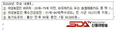 ´ë»óÀº µµ³» ³óÃÌÁö¿ª¿¡ °ÅÁÖÇÏ¸ç ³ó¾÷°æ¿µÃ¼¿¡ µî·ÏµÈ ¸¸ 20¼¼ ÀÌ»ó 75¼¼ ¹Ì¸¸ ¿©¼º³ó¾÷ÀÎÀÌ´Ù. ¿ÃÇØºÎÅÍ´Â ³óÇù Àü¿ë ¹Ù¿ìó Ä«µå ¹ß±Þ ¶Ç´Â ±âÁ¸ ä¿òÄ«µå Æ÷ÀÎÆ® ¹æ½Ä Áß ¼±ÅÃÇÒ ¼ö ÀÖµµ·Ï °³¼±µÆ´Ù. Áö¿ø±ÝÀº °Ç°°ü¸®¿Í ¹®È¡¤¿©°¡ Ȱµ¿ µî ´Ù¾çÇÑ ºÐ¾ß¿¡ »ç¿ëÇÒ ¼ö ÀÖÀ¸¸ç, »ç¿ë±âÇÑÀº 2026³â 12¿ù 31ÀϱîÁö´Ù.
