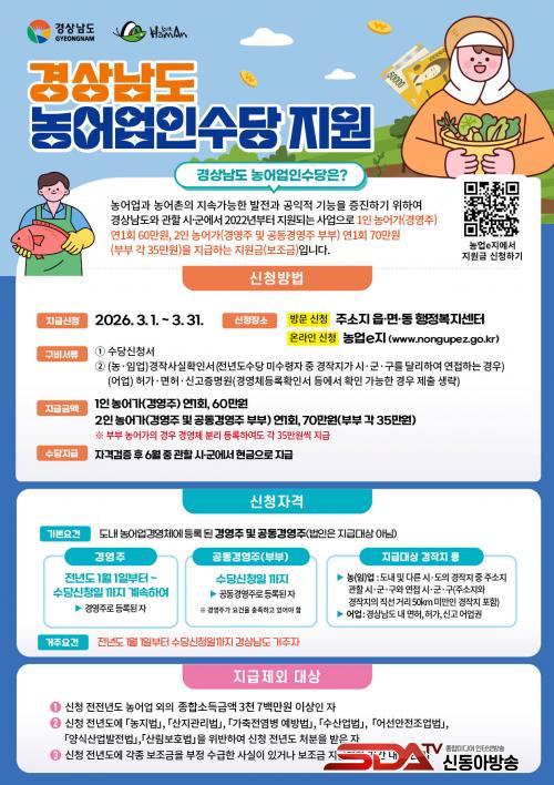 ½Åû ´ë»óÀº 2025³â 1¿ù 1ÀϺÎÅÍ °æ»ó³²µµ¿¡ Áֹεî·ÏÀ» µÎ°í ³ó¾î¾÷°æ¿µÃ¼·Î µî·ÏµÈ °æ¿µÁÖ¿Í °øµ¿°æ¿µÁÖÀ̸ç, °øµ¿°æ¿µÁÖ´Â ºÎºÎ¸¸ ÀÎÁ¤ÇÑ´Ù. ½ÅûÀº ÁÖ¼ÒÁö À¾¸éµ¿ ÇàÁ¤º¹Áö¼¾Å͸¦ ¹æ¹®ÇØ ÇÒ ¼ö ÀÖÀ¸¸ç, ¡®³ó¾÷ÀÌ(e)Áö¡¯ ´©¸®Áý°ú ¾Û¿¡¼ °£ÆíÇÏ°Ô ½ÅûÇÒ ¼ö ÀÖ´Ù.