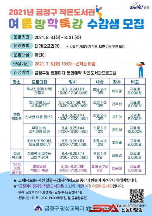 ƯÈ÷ ³»´Þ 3ÀÏ °³°üÇÏ´Â ±ÝÁ¤¼¼´ë°ø°¨¼¾ÅÍ ³» ±ÝÁ¤¾ÆÀ̲ÞÀÚ¶÷ ÀÛÀºµµ¼°ü¿¡¼´Â À¯¾Æ 6, 7¼¼¸¦ ´ë»óÀ¸·Î ¡âÃ¥ ³îÀÌ ÇÁ·Î±×·¥ÀÌ ÁøÇàµÈ´Ù. ±âŸ ÀÚ¼¼ÇÑ »çÇ×Àº ±ÝÁ¤±¸ Æò»ý±³À°°ú(051-519-5634)·Î ¹®ÀÇÇÏ¸é µÈ´Ù.