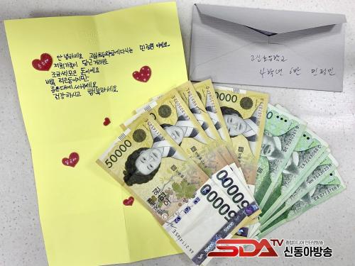 ºÀÅõ¿¡´Â ¡®ÇÏÆ®¡¯ ½ºÆ¼Ä¿°¡ ºÙÀº ³ë¶õ»ö ÆíÁöÁö¿Í 5¸¸ ¿ø ±Ç 5Àå°ú 1¸¸ ¿ø ±Ç 5Àå µî ÃÑ 30¸¸ ¿øÀÇ ÁöÆó°¡ µé¾îÀÖ¾ú´Ù.