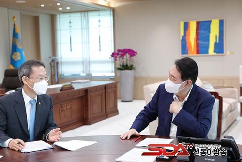 ÀÌÁ¾È£ °úÇбâ¼úÁ¤º¸Åë½ÅºÎ Àå°ü(¿ÞÂÊ)ÀÌ ¿ë»ê ´ëÅë·É½Ç¿¡¼ À±¼®¿ ´ëÅë·É¿¡°Ô ¾÷¹«º¸°í¸¦ ÁøÇàÇϰí ÀÖ´Ù. (»çÁø=´ëÅë·É½Ç)