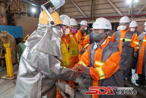 Á¤ ½ÃÀåÀº ÇöÀå Á÷¿øµé¿¡°Ô Á÷Á¢ °Ý·ÁÀÇ Àλ縦 ÀüÇϱâ À§ÇØ ¾ÈÀüº¹°ú ¾ÈÀüº¸È£±¸¸¦ Âø¿ëÇÏ°í °øÀå °÷°÷À» ´Ù´Ï¸ç ¼¼°è ÃÖ°íÀÇ Ã¶°­ Á¦Ç°À» »ý»êÇϱâ À§ÇØ ¹¬¹¬È÷ Èû¾²´Â Á÷¿øµéÀÇ ³ë°í¿¡ °¨»ç¸¦ Ç¥Çß´Ù.