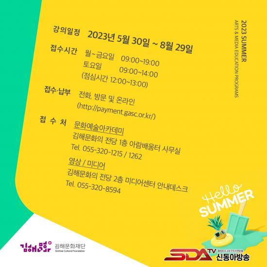 2023³â ¹®È¿¹¼ú¾ÆÄ«µ¥¹Ì ¿©¸§Çбâ´Â 5¿ù 30ÀÏ(È)ºÎÅÍ 8¿ù 29ÀÏ(È)±îÁö ¿î¿µµÇ¸ç °ü·Ã ¹®ÀÇ´Â ÀüÈ 055-320-1215(¾Æ¶÷¹è¿òÅÍ), 055-320-1262(¹®È¿¹¼ú), 055-320-8594(¿µ»ó/¹Ìµð¾î)·Î ÇÏ¸é µÈ´Ù. º¸´Ù ÀÚ¼¼ÇÑ »çÇ×Àº ±èÇØ¹®ÈÀÇÀü´ç ȨÆäÀÌÁö(https://www.gasc.or.kr/sub/academy_info.php)¿¡¼ È®ÀÎÇÒ ¼ö ÀÖ´Ù.