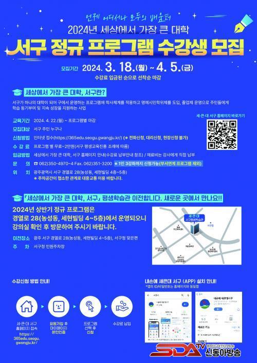 ¿î¿µ ÇÁ·Î±×·¥Àº ¡ã½Ã¹ÎÂü¿©Çаú 10°³ °úÁ¤(¿ì¸®¸¶À»»ýÅÂÇØ¼³»ç ¾ç¼º°úÁ¤ µî) ¡ãÀι®»çȸÇаú 7°³ °úÁ¤(Ä«ÇÁÄ«·Î Àд °¡Á· Àι®ÇÐ, ¼¾çöÇп¡¼ ¹è¿ì´Â »îÀÇ ÁöÇý µî) ¡ã¹®È¿¹¼úÇаú 9°³ °úÁ¤(½Ã´Ï¾î¸ðµ¨, ³» ¼ÕÀ¸·Î ¸¸µå´Â ¼ô ´ÜÆí¿µÈ µî) ¡ãÁֹΰǰÇаú 1°³ °úÁ¤(°È±âÁöµµÀÚ ¾ç¼º°úÁ¤) ¡ãÀü³²´ëÄ¿¹Â´ÏƼÇаú 3°³ °úÁ¤(È£³²ÀÇ ¼Á¤À» Àϱ¸¾î³½ ½ÃÀÎµé µî) ÃÑ 5°³ Çаú 30°³ °ÁÂÀ̸ç, 4¿ù 22ÀϺÎÅÍ »õ·Î ÀÌÀüÇÏ´Â ¼±¸Æò»ýÇнÀ°ü(°æ¿·Î 28, ³ó¼ºµ¿ ¼¼Çöºôµù 4Ãþ~5Ãþ)¿¡¼ ÁøÇàµÈ´Ù.
