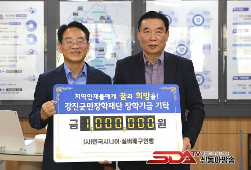 *»çÁø¼³¸í : (»ç)Çѱ¹½Ã´Ï¾î¡¤½Ç¹ö ¹è±¸¿¬¸Í ±è¿ëÅ ȸÀåÀÌ °Áø¿ø ±º¼ö¿¡°Ô ÀåÇбÝÀ» Àü´ÞÇϰí ÀÖ´Ù.