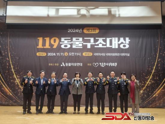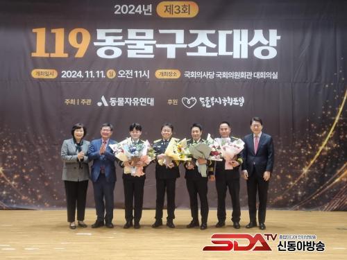 ¡Û ¿ÃÇØ·Î Á¦3ȸ¸¦ ¸ÂÀÌÇÑ ¡®119µ¿¹°±¸Á¶´ë»ó¡¯Àº µ¿¹°ÀÚÀ¯¿¬´ë°¡ ÁÖÃÖÇÏ°í µ¿¹°º¹Áö±¹È¸Æ÷·³ÀÌ ÈÄ¿øÇÏ¿© µ¿¹°±¸Á¶ ¹× º¸È£¿¡ Çå½ÅÇÏ°í »çȸÀû ÀÎ½Ä º¯È¿¡ ³ë·ÂÇÑ ¼Ò¹æ±â°ü°ú ¼Ò¹æ±¸Á¶´ë¿ø¿¡°Ô ¼ö¿©ÇÏ´Â »óÀ¸·Î¼ ¼ö»óÀÚ·Î ¼±Á¤µÈ ±â°üÀº °¨»çÆÐ¿Í ÇÔ²² »ó±Ý 1,000¸¸¿øÀÌ ¼ö¿©µÈ´Ù.