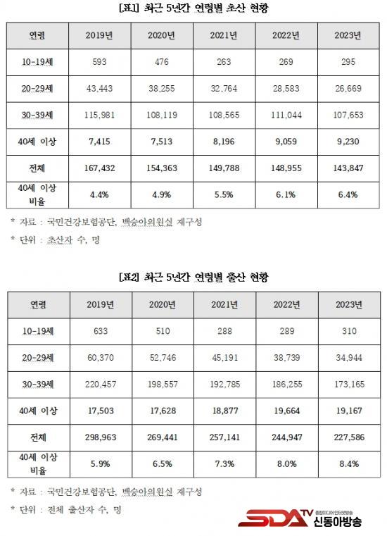 ¡à 2019³â ´ëºñ 2023³â 20~29¼¼ ÃÊ»ê »ê¸ð´Â 38.6% °¨¼ÒÇß°í 30~39¼¼ ÃÊ»ê »ê¸ðµµ 7.2% °¨¼ÒÇÑ ¹Ý¸é, 40¼¼ ÀÌ»ó ÃÊ»ê »ê¸ð ºñÀ²Àº 2019³â 7,415¸í, 2020³â 7,513¸í, 2021³â 8,196¸í, 2022³â 9,059¸íÀ̾ú°í, 2023³âÀº 9,230¸íÀ¸·Î 2019³â ´ëºñ 24.5% Áõ°¡Çß´Ù.