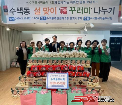 À̳¯ ¼ö»öµ¿ »õ¸¶À»ºÎ³àȸ¿øµéÀº Ãë¾à°èÃþ 1¹é °¡±¸¿¡ ¶±±¹¶±°ú ½Ä·áǰÀ¸·Î ±¸¼ºµÈ º¹ ²Ù·¯¹Ì¸¦ Àü´ÞÇϰí, ÀÌ¿ôµéÀÇ ¾ÈºÎ¸¦ »ìÇÇ¸ç ¸íÀý ¿Â±â¸¦ ÀüÇß´Ù.