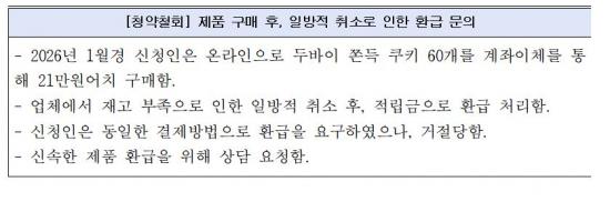 Çѱ¹¼ÒºñÀÚ¿ø 1372 ¼ÒºñÀÚ»ó´ã¼¾ÅÍ Á¢¼ö ÇöȲÀ» º¸¸é 2024³â 0°Ç, 2025³â 1°Ç¿¡ ºÒ°úÇßÀ¸³ª, 2026³â 1¿ù 25°Ç, 2¿ù 1°Ç µî µÎ ´Þ°£ 26°ÇÀÌ Á¢¼öµÆ´Ù. 2024³âºÎÅÍ 2026³â 2¿ù±îÁö ´©Àû 27°Ç °¡¿îµ¥ 26°Ç(¾à 96%)ÀÌ 2026³â¿¡ ÁýÁßµÅ, ¿ÃÇØ µé¾î ¼ÒºñÀÚ ºÒ¸¸ÀÌ º»°ÝÀûÀ¸·Î Ç¥¸éÈ­µÈ °ÍÀ¸·Î ºÐ¼®µÈ´Ù.