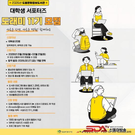 [½Åµ¿¾Æ¹æ¼Û µµºÀ±¸=À̽ŵ¿±âÀÚ] ¼­¿ï µµºÀ±¸ µµºÀ¹®È­Àç´Ü µµºÀ¹®È­Á¤º¸µµ¼­°üÀÌ ´ëÇлý ¼­Æ÷ÅÍÁî ¡®µµ·¡¹Ì 11±â¡¯¸¦ 2¿ù 21ÀϱîÁö ¸ðÁýÇÑ´Ù.