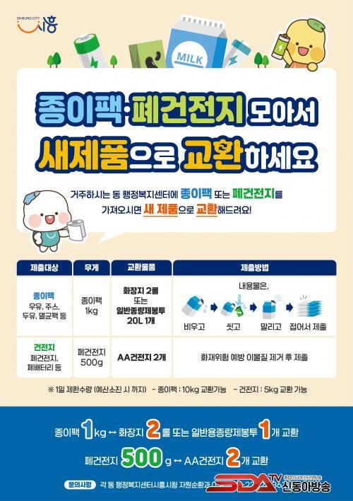 ¿ìÀ¯ ÆÑ, ÁÖ½º ÆÑ, µÎÀ¯ ÆÑ, ¸ê±Õ ÆÑ µî Á¾ÀÌ ÆÑÀº ¡®³»¿ë¹°À» ºñ¿ì°í ¹°·Î Çó±º µÚ °ÇÁ¶ÇØ ÆîÄ£ »óÅ¡¯·Î °üÇÒ µ¿ ÇàÁ¤º¹Áö¼¾ÅÍ¿¡ °¡Á®¿À¸é µÈ´Ù. Á¾ÀÌ ÆÑÀº 1§¸´ç È­ÀåÁö 2·Ñ ¶Ç´Â Á¾·®Á¦ºÀÅõ(ÀÏ¹Ý 20§¤) 1ÀåÀ¸·Î ±³È¯µÇ¸ç, 1Àδç 1ÀÏ ÃÖ´ë 10§¸±îÁö °¡´ÉÇÏ´Ù. Æó°ÇÀüÁö´Â È­Àç ¿¹¹æÀ» À§ÇØ À̹°ÁúÀ» Á¦°ÅÇÑ ÈÄ Á¦ÃâÇϸé 500g´ç AA °ÇÀüÁö 2°³·Î ±³È¯ÇÒ ¼ö ÀÖÀ¸¸ç, 1Àδç 1ÀÏ ÃÖ´ë 5§¸±îÁö ±³È¯ÀÌ °¡´ÉÇÏ´Ù.